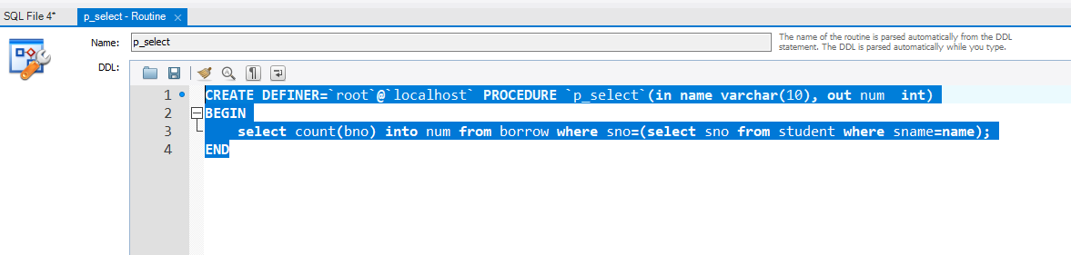 1 | CREATE DEFINER=`root`@`localhost` PROCEDURE `p_select`(in name varchar(10), out num int) |